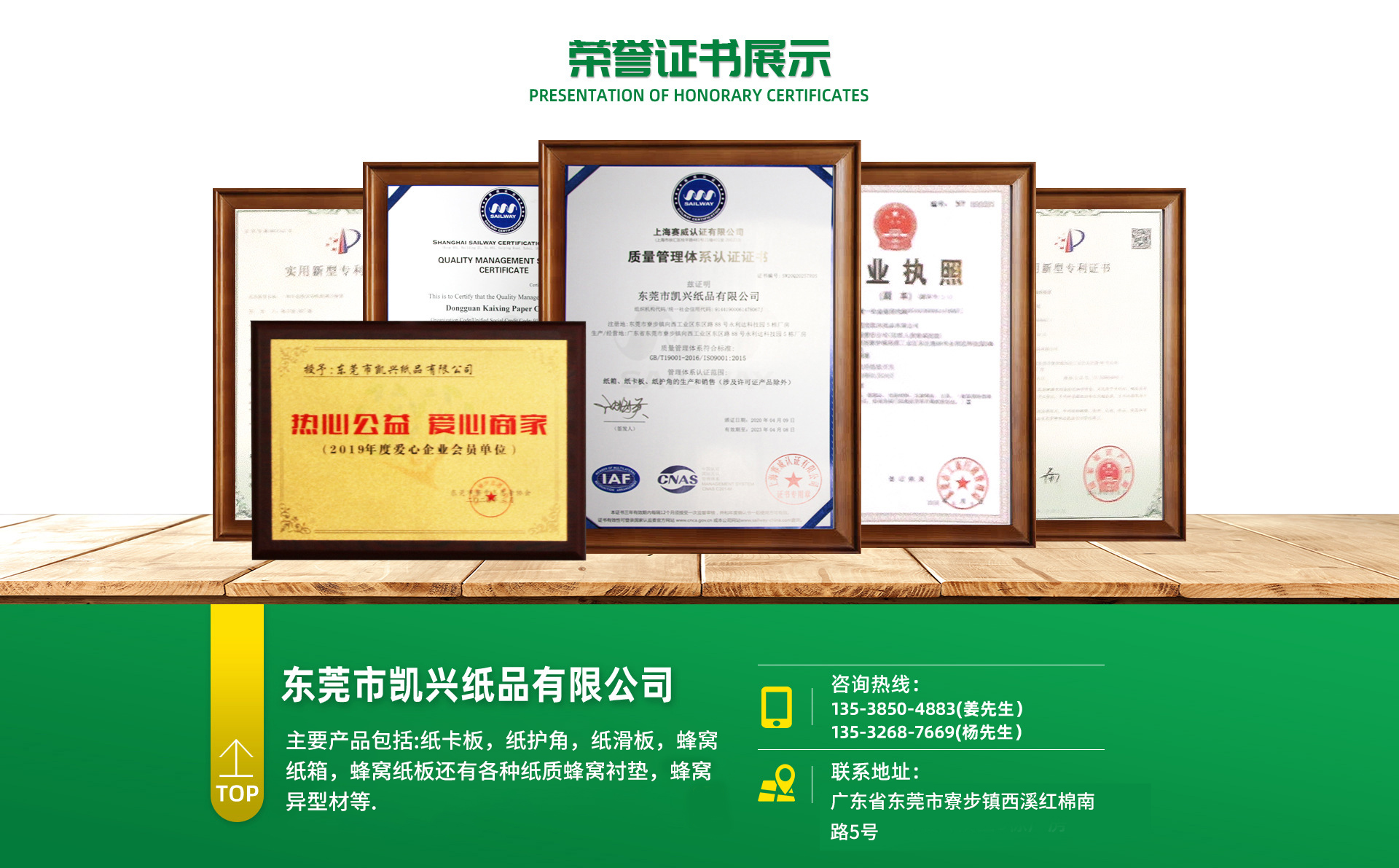 東莞市凱興紙品有限公司建立于2008年,是一家專業生產環保包裝材料的紙品廠,主要產品包括:蜂窩紙板、紙護角、紙卡板、紙托板、蜂窩箱、紙滑板,禮品盒,還有各種紙質緩沖襯墊,蜂窩異型材等。該材料廣泛應用于電器、家具、建筑內墻等行業;所有產品都是以紙為原材料制作而成,是各種產品包裝的理想內襯材料,也是替代(EPS)發泡膠最理想的材料,該材料成本低廉,又可100%回收利用,完全符合歐盟ROHS要求。紙護角代替木方,角鐵等起支撐保護作用.紙卡板,紙托盤用來代替木卡板、塑膠棧板出口裝貨柜使用,免熏蒸,材料符合紙卡板行業ROHS環保標準,取得紙卡板SGS無毒檢測報告!